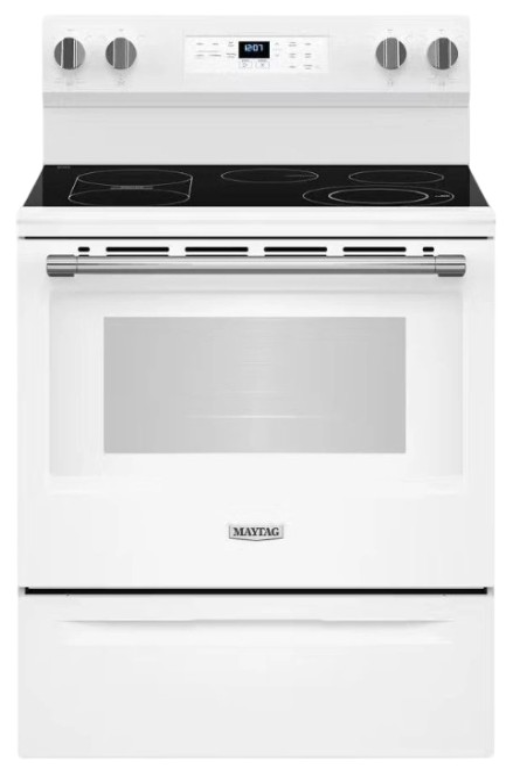 Sturdy door hinges on this Maytag® electric range are built for dependability, while the fingerprint resistant stainless finish and ceramic glass cooktop help make cleaning easy.